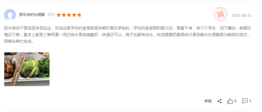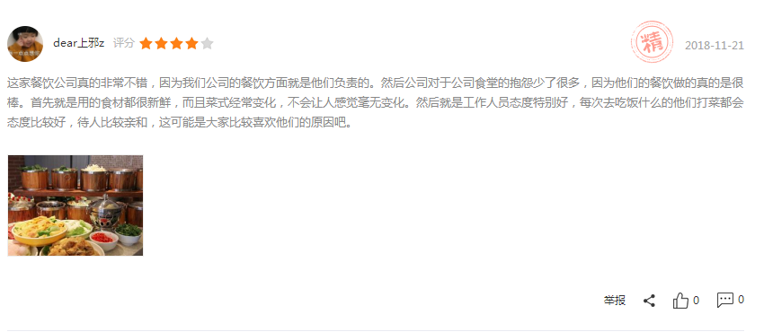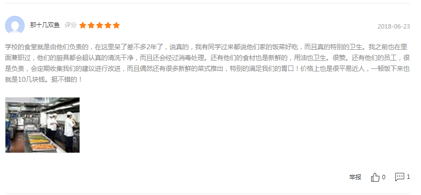 ? ? ? ?北京京朝軒餐飲管理有限公司在食堂承包運(yùn)營(yíng)方面正在走向高質(zhì)量發(fā)展!不僅在菜品口味方面嚴(yán)格把關(guān),而且在食品安全方面更加重視。以下截屏是客戶的真實(shí)評(píng)價(jià):