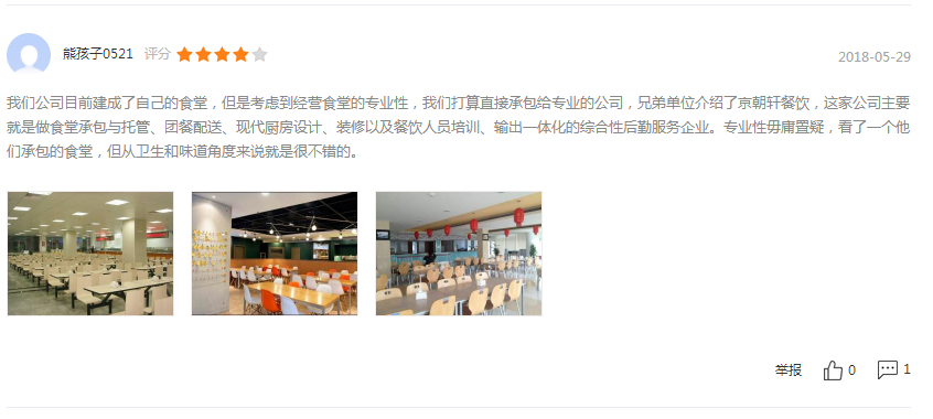 ? ? ? ?北京京朝軒餐飲管理有限公司近幾年在食堂運(yùn)營(yíng)口碑方面得到了許多客戶的認(rèn)可,同時(shí)我司也奉行“微利經(jīng)營(yíng),長(zhǎng)足發(fā)展”的經(jīng)營(yíng)宗旨,能讓客戶得到實(shí)惠,達(dá)到雙贏。以下截屏是客戶的真實(shí)評(píng)價(jià):