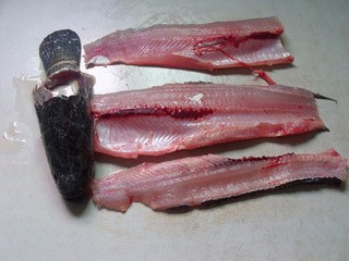 1、準(zhǔn)備好材料,魚(yú)洗凈去頭,用到從脊背處處理成兩片。
