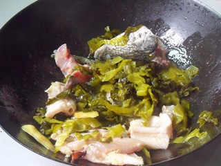 4、酸菜切絲焯水備用。辣椒切圈和花椒一起。魚(yú)頭骨魚(yú)皮準(zhǔn)備好,姜切片。鍋里放油炒香蔥姜蒜,下入魚(yú)頭魚(yú)尾魚(yú)骨頭魚(yú)皮等炒一分鐘。放入酸菜繼續(xù)炒一分鐘。兌足量開(kāi)水。